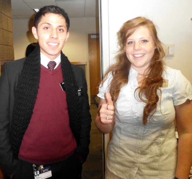 These past two days have been the longest days of my life! But they are starting to get faster......thankfully. I can not even remember everything that has happened. But anyway for the record I have not had a problem waking up and going to bed on time. My companion's name is Hermana Alexander. She learned her spanish from her dad being a Mission President in Mexico for three years. She is happy and easy to get along with thankfully! Well after entering the MTC for 20 minutes, I was thrust into my class. It was majority latinos and the class was all in spanish. It was slightly overwhelming but I was able to understand pretty much everything. My teacher Hermana Delion is from Columbia. It definitely took some getting used to. I have heard so much espanol these past few days. My thoughts pretty much are consumed in spanish these days. (Sorry if this email feels repetitive to the letter home)